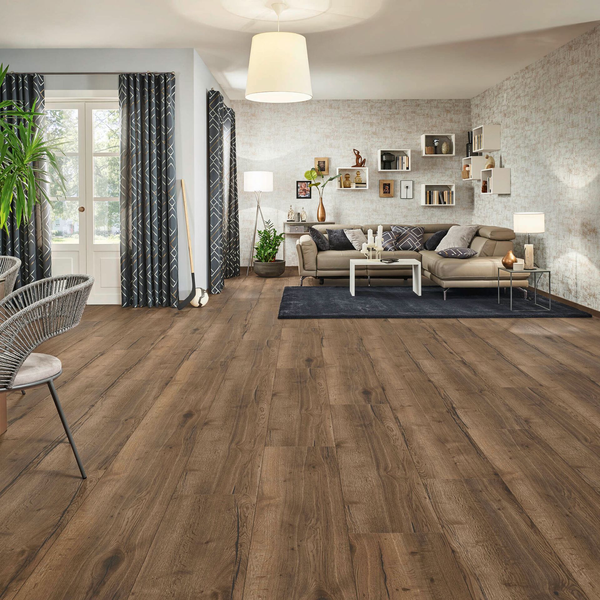 Was für den Laminatboden spricht: Zunächst einmal ist er sehr robust und besonders strapazierfähig. Diese Eigenschaften verdankt er den unter hohem Druck und ebensolchen Temperaturen gepressten Schichten. Die Deckschicht garantiert außerdem eine hohe Abriebfestigkeit. Laminat ist ein reiner Dekorboden, daher ist durch den digitalen Druck auf der Deckschicht praktisch alles an Design und Gestaltung möglich. Favorit ist aber immer noch die gute alte Holzoptik, die dem Parkett meist zum Verwechseln ähnlich sieht. Außerdem sind Laminate perfekt für Fußbodenheizungen geeignet – und meist sogar nebelfeucht wischbar, also äußerst pflegeleicht.
